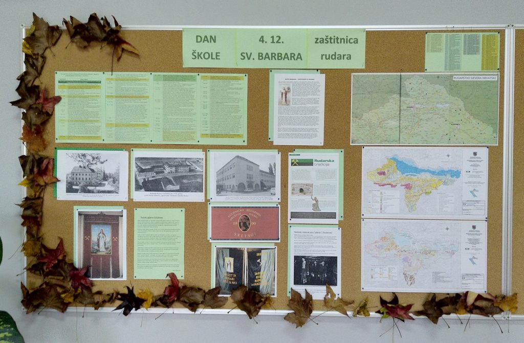 Učenici programa Geološki tehničar i Rudarski tehničar, te voditelj stručnog vijeća geologije i rudarstva Ivica Inkret, pripremili su vizualno obilježavanje dana škole. Sveta Barbara, čiji se spomendan slavi 4. prosinca, tradicionalno je birana zaštitnicom zanimanja koja su se smatrala opasnima, ponajviše rudara. Brojni kipovi, slike, zastave, crkve u Hrvatskoj i u svijetu, svjedoče o njenoj popularnosti kroz povijest. Kako je naša škola slijednik Rudarske nadzorničke škole, utemeljene davne 1939. godine, do danas obilježava svoj dan na spomendan Svete Barbare.