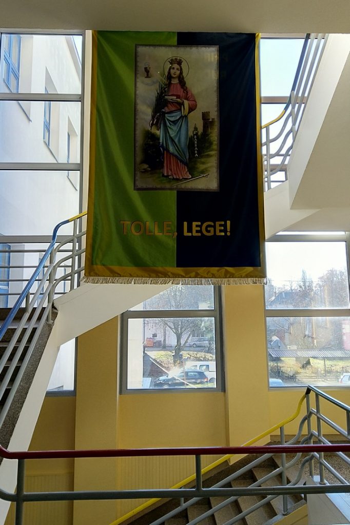 Ovom prilikom po prvi put je predstavljena i tradicijska zastava škole. Uz rijedak primjer prikaza svetice s knjigom dobro se uklapa slogan Tolle, lege! (Uzmi, čitaj!), što sasvim odgovara namjeni ustanove i prostoru ispred knjižnice.