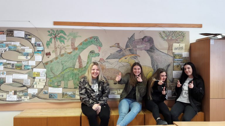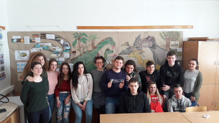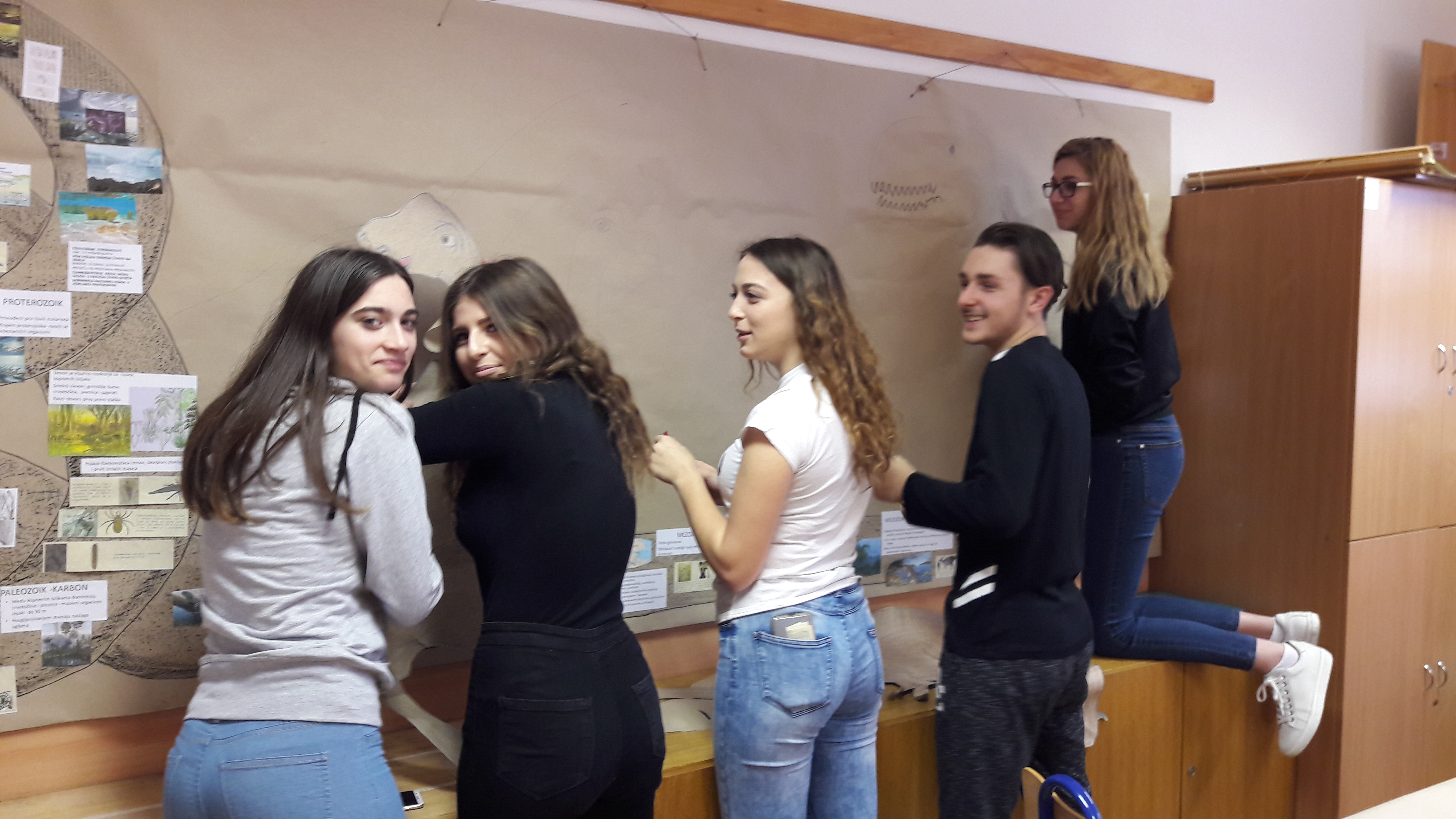 Na satovima biologije učenici 4.gim razreda bavili su se pitanjima nastanka i razvoja života na Zemlji. Osmislili su i dizajnirali veliki zidni plakat koji prikazuje vremensku lentu s geološkim razdobljima i opisom životnih uvjeta u kojima su se, tijekom evolucije, razvijale nove skupine organizama. Tko je sve hodao našim planetom i kako je izgledala Zemlja kroz geološka razdoblja, možete pogledati u učionici B11. Najbrojniju skupinu životinja u mezozoiku, dinosaure vladare svijetom do prije 65 milijuna godina, oslikali su naši vješti ilustratori, učenici 4.gim, 1.e i 1.d razreda.